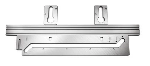 Plus twee naar keuze positioneerbare freessjablonen voor het bevestigen van standaard verkrijgbaar verbindingsbeslag aan de onderkant van platen