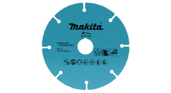 Makita 125 mm doorslijpschijf voor het doorslijpen van PVC, gipsplaat, vezelmaterialen en glasvezel versterkt kunststof (GVK). De segmenten zijn voorzien van hardmetalen korrels wat een hoge snijsnelheid oplevert. De hardmetalen korrels zijn lasergelast wat resulteert in een langere levensduur. We raden het sterk af in hout te slijpen. De kans op terugslag is vrij groot. Tevens kunnen er vonken in de stofzuiger komen wanneer je in hout met metaal/spijkers slijpt.